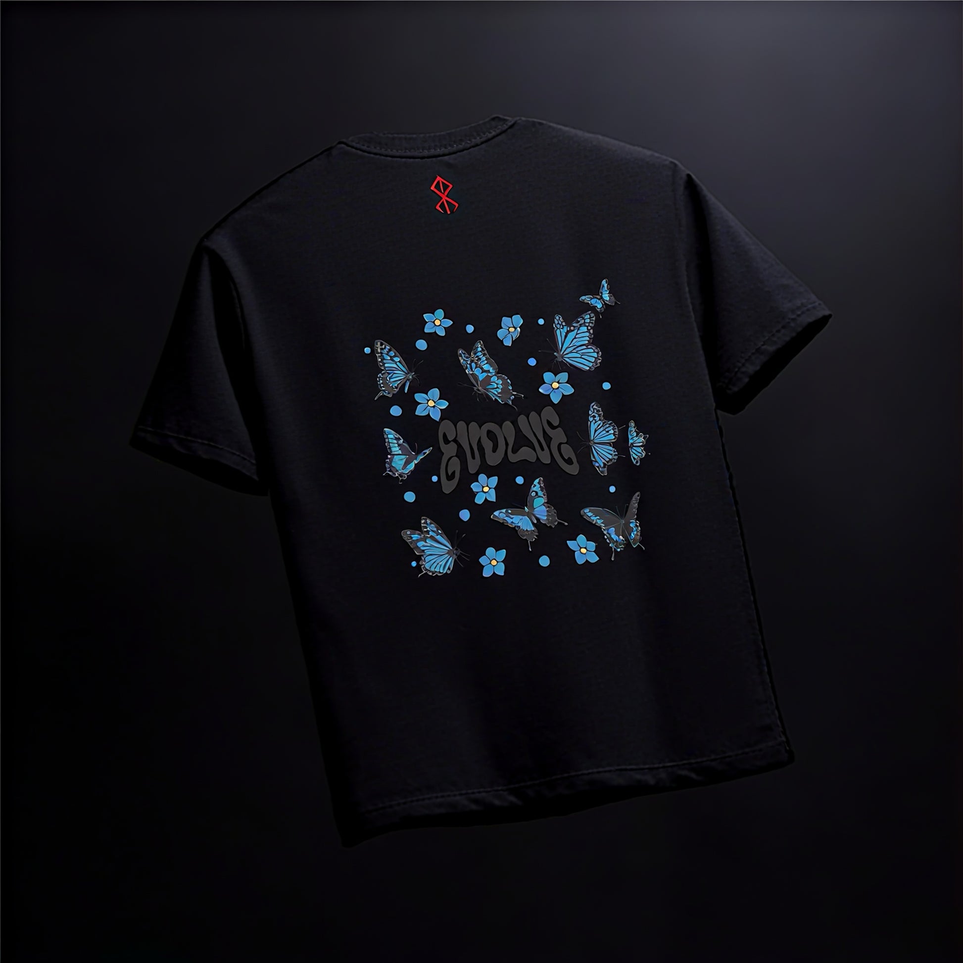 Blue butterflies are back and better than ever. This Y2K aesthetic tee brings 2000s nostalgia into 2025 with a meaningful twist—the word ‘Evolve’ surrounded by whimsical butterflies and forget-me-nots. It’s playful, it’s powerful, and it’s proof that the best trends always come full circle. Evolve constantly, stay golden