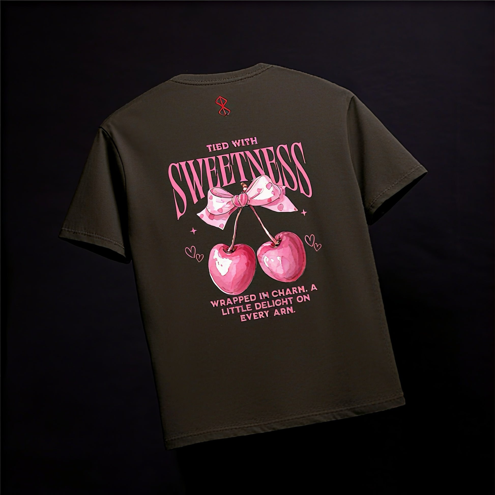 Embrace the coquette aesthetic with this charming brown t-shirt featuring a delicate pink cherry bow design and playful romantic messaging. The “Tied with Sweetness” graphic showcases watercolor-style cherries adorned with a soft pink bow, accompanied by tiny hearts and the whimsical tagline “Wrapped in charm, a little delight on every arm”.